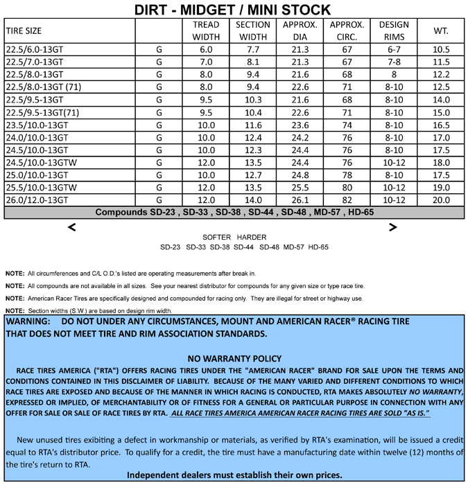 of Midget & Mini Stock Dirt tires, see the technical specifications